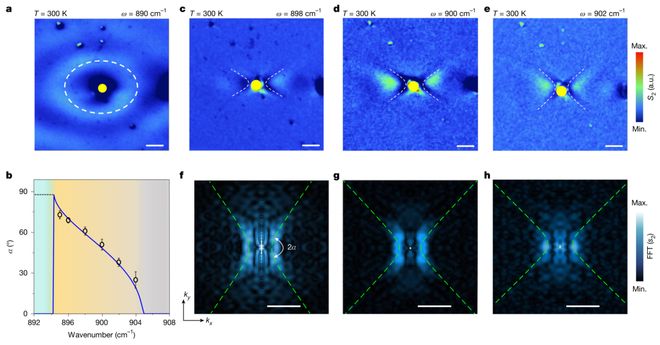 利用散射式近场光学显微镜(s-SNOM),团队在金盘纳米天线激发的YVO₄表面直接观测到极化激元波前动态变化:890 cm⁻¹时为椭圆波前(图2a),随频率升高逐渐过渡为双曲波前(图2c-e)。FFT分析(图2f-h)进一步证实其双曲色散特征,且开放角α随频率增加而减小(图2b),与理论预测一致。