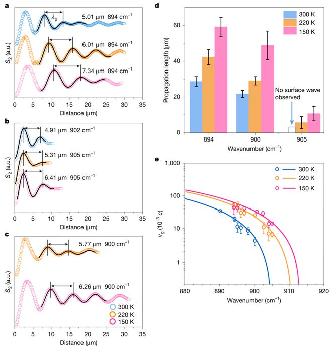 线a-c)显示:温度降低可显著增加极化激元波长(如894 cm⁻¹椭圆态波长随温度下降而增大)。低温还大幅提升传播距离——150 K时椭圆极化激元传播长度达59 μm(图4d),沟道化态达48 μm,归因于声子散射抑制带来的低损耗特性。群速度分析(图4e)进一步揭示温度对能量传输速率的调控能力。