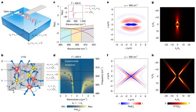 研究团队通过理论模型(图1a-b)和傅里叶变换红外光谱(图1c)证实:YVO₄晶体在800–950 cm⁻¹频段内介电分量(ε∥与ε⊥)均为负值,不符合传统双曲晶体定义。然而,数值模拟显示其表面可支持双曲极化激元:在890 cm⁻¹频率下电场呈椭圆波前(图1e),而900 cm⁻¹时转变为双曲波前(图1f)。快速傅里叶变换(FFT)谱(图1g-h)与理论等频线高度吻合,揭示了非双曲材料中双曲表面模式的物理基础。