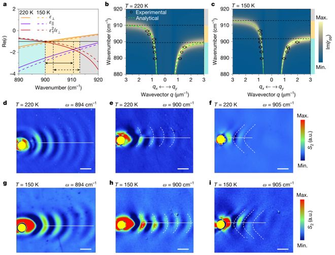 通过低温调控(220 K与150 K),YVO₄介电分量发生蓝移(图3a),导致双曲极化激元频段偏移。在220 K下,894 cm⁻¹频率呈椭圆波前(图3d),900 cm⁻¹时因色散平坦化出现沟道化传播(图3e),905 cm⁻¹时演化为双曲波前(图3f);150 K下相同频率亦观察到类似相变(图3g-i)。这一现象首次实现了无需微纳加工的原位动态拓扑调控。