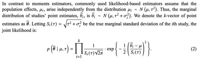 其中,系数 aᵢ 的形式在不同的矩法估计量之间有所不同。例如,传统的 DerSimonian–Laird 估计量(DL)¹ 设定 aᵢ = 1/σᵢ²。两步法 DL 估计量(DL2)² 则设定 aᵢ = 1/(τ̂²_DL + σᵢ²),其中 τ̂²_DL 是通过 DL 估计量获得的初始估计值。Paule–Mandel(PM)³,⁴ 估计量可视为 DL2 的一个极限情形,涉及对 μ̂ 和 τ̂² 的估计值进行迭代直至收敛。该估计量也等价于经验贝叶斯估计量。⁵ 一般而言,经验贝叶斯估计利用观测数据来估计贝叶斯先验参数,而非独立于数据预先指定先验。²¹ 在元分析的背景下,经验贝叶斯估计本质上是通过后验均值来估计总体效应的分布,其先验由数据经验确定。⁵