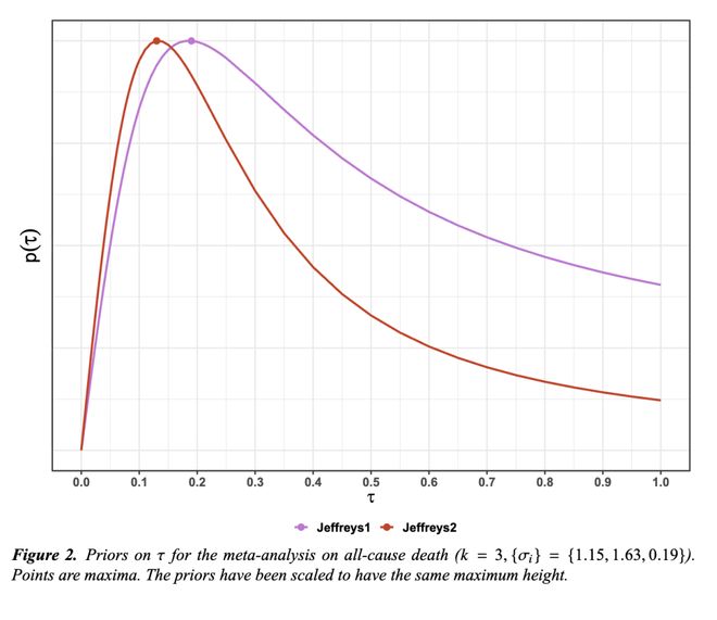 在本文中,我们同时考虑 Jeffreys1 先验以及针对 μ 和 τ 的双参数杰弗里斯先验。据我们所知,后者尚未出现在已发表的元分析文献中。我们将后者称为“Jeffreys2”,原因有三。首先,虽然在元分析中均值参数通常是主要关注对象,但异质性也应通常被估计并报告,因此将 τ 视为干扰参数可能并非最优。³² 第二,在其他小样本估计问题中,包含尺度参数(例如指数族模型中的离散参数)的多参数杰弗里斯先验已被提出,并表现出良好的经验性质。²⁶,²⁸,³³ (我们将在第 3.3 节中重新讨论此问题。)在通过元分析截断部分随机效应分布来调整 p 值挖掘的背景下,我们最近发现,对 μ 和 τ 使用杰弗里斯先验的表现明显优于 ML,而 ML 在截断分布情形下通常表现极差。²⁸,³⁵ 第三,正如我们将要讨论的,Jeffreys2 先验的形状表明它可能比 Jeffreys1 先验提供更精确的区间。Jeffreys2 可信区间是否能实现名义频率学派覆盖,以及对 μ 和 τ 的点估计表现如何,仍是开放性问题。