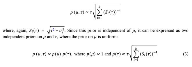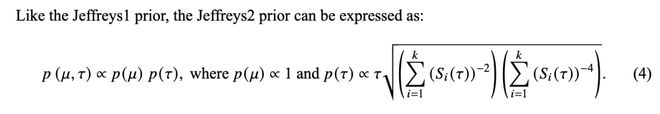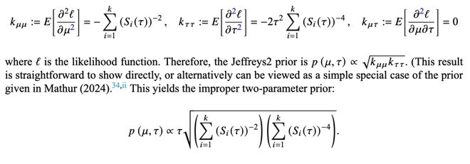 在总体效应服从正态分布的假设下,Bodnar 等人(2017)¹⁵ 证明了非正常化的 Jeffreys1 先验为: