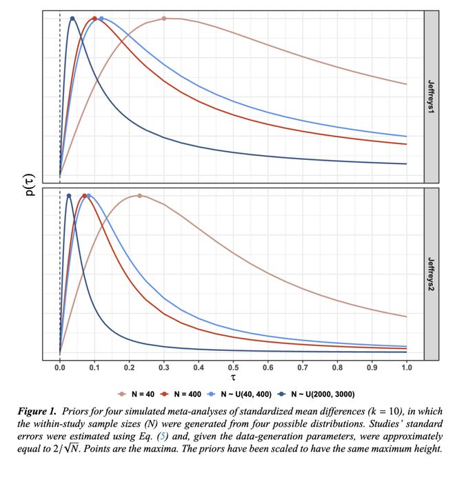 为便于说明,图1展示了四种标准化均值差异元分析中两种先验在 τ 上的分布。这些元分析是通过从四种不同分布中抽取研究样本量 N 模拟生成的。尽管先验的幅度当然会受研究数量 k 的影响,但其形状受 k 的影响极小,因此图1描绘的是 k = 10 项研究的元分析所对应的先验。请注意,对于每项元分析,Jeffreys2 先验比 Jeffreys1 先验略窄,这表明前者可能提供更窄的区间;这一假设将在模拟研究(第4节)中进一步深入探讨。当 k 1 时,这两种先验均可导出适当的后验分布(参见 Bodnar (2017)¹⁵ 关于 Jeffreys1 的论述,以及补充材料第1节关于 Jeffreys2 的内容)。此外,两种先验均可轻松推广至元回归情形:Jeffreys1 先验将与 Bodnar 等人(2024)⁵⁰ 提出的广义边际随机效应模型中的先验一致;而 Jeffreys2 先验在元回归中的形式则推导于补充材料第1节。本文正文不再进一步讨论元回归。