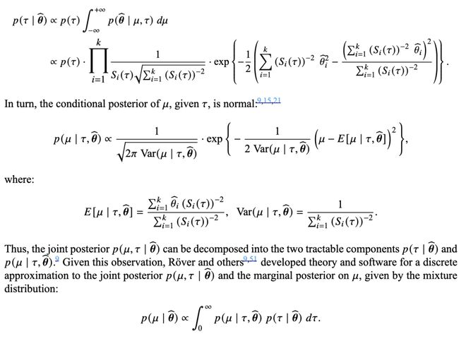 离散近似方法无需通过混合链蒙特卡洛(MCMC)进行抽样,并已在 R 软件包 bayesmeta 中实现。⁹,⁵¹ 我们在模拟研究和应用实例中均使用了该软件包。