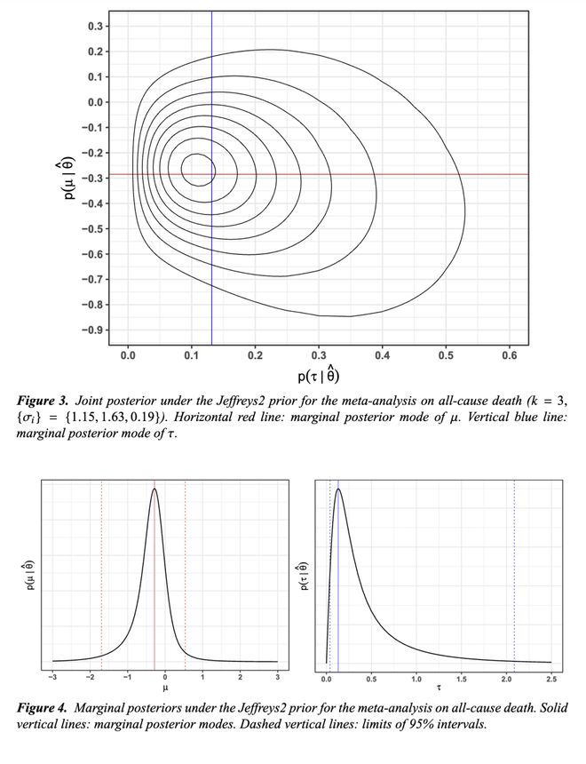 鉴于杰弗里斯先验作为小样本中偏差校正方法的有效性,将其应用于小型元分析以改进点估计和区间估计似乎是合理的。Bodnar 等人(2016, 2017)¹⁵,³⁰ 推导了仅针对异质性 τ 的杰弗里斯先验(即保持均值 μ 不变),如果 τ 严格被视为干扰参数,这种方法可能是最优的。²⁵ 他们的模拟研究表明,结合对 μ 的独立平坦先验,所得的可信区间可能比现有的频率学派方法具有更好的频率学派覆盖性能。¹⁵ 我们将这种先验称为“Jeffreys1”,因为它是针对单个参数的先验。Kosmidis 等人(2017)³¹ 独立推导出一种惩罚似然校正方法,其等价于仅针对 μ 的单参数杰弗里斯先验;也就是说,将 μ 而非 τ 视为干扰参数。这种惩罚与 τ 的受限最大似然(REML)估计密切相关。³¹
