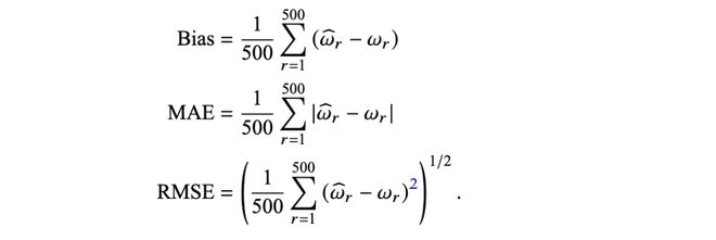 对于每种情景,我们以频率学派通常意义下的偏倚、平均绝对误差(MAE)和均方根误差(RMSE)来评估点估计量的表现与变异性。即,对于一个在 500 次模拟迭代 r 中变化的通用参数 ωᵣ: