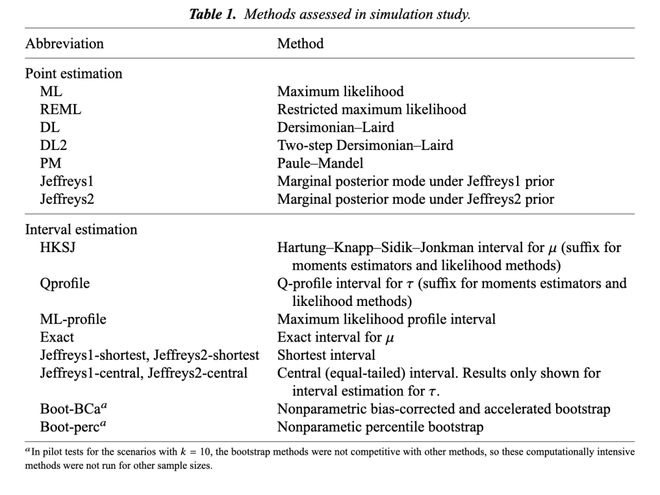 一种有趣且相对较新的方法提供的是精确区间而非渐近区间,并在假设总体效应服从正态分布的前提下,理论上保证提供超过名义覆盖水平的性能。¹⁸ 该方法本质上涉及对精确检验进行反演。其他参数化方法则对似然比检验统计量提供小样本校正;这些方法包括 Skovgaard 的二阶校正和 Bartlett 校正。³⁸⁻⁴⁰ 这些方法可改进基础似然方法在假设检验中的表现,⁴⁰ 但 Skovgaard 的二阶校正并非为区间估计而设计,在此情境下数值上可能不稳定。³¹ 使用 Bartlett 校正进行区间估计是可行的,⁴¹ 但在现有软件中并未实现(I. Visser, 个人通讯,2024 年 7 月 8 日)。⁴²,⁴³ 由于我们的关注点在于区间估计而非假设检验,因此我们的模拟未包含 Skovgaard 或 Bartlett 校正。最后,各种参数化或非参数重抽样方法可用于获得自助法置信区间。¹⁹,⁴³,⁴⁴ 非参数重抽样可通过有放回地重抽样行数据实现,之后可获得简单的百分位自助法区间,或偏差校正并加速(BCa)区间等多种类型的自助法区间。⁴⁵,⁴⁶ BCa 置信区间可校正自助抽样分布中的偏差与偏度,我们推测这在估计 τ 的抽样分布时可能有所帮助。BCa 自助法在某些依赖于 τ̂ 的元分析估计量中表现相对良好。⁴⁷ 然而,自助法是一种渐近方法,其小样本表现通常需通过模拟评估。