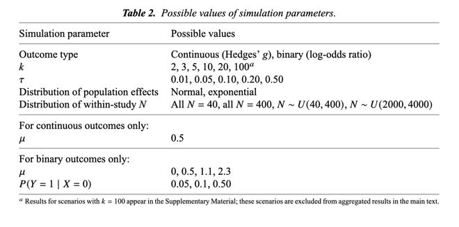 表 2 总结了我们操纵的模拟参数,这些参数与 Langan 等人(2019)⁷ 的模拟研究相似。我们考虑了连续结局(效应量采用 Hedges’ g 尺度⁵⁶)和二分类结局(效应量采用对数优势比尺度)。我们同时考虑了总体效应服从正态分布和指数分布的情形;在后一种情况下,除矩法估计量外,所有点估计方法的基本假设均被违反。统计理论表明,在具有正态效应的大样本元分析中,所有方法的表现将大致相当,因此我们的重点在于较小规模元分析(k ≤ 20)中的点估计和区间估计。正文报告的主要模拟结果对应 k ∈ {2, 3, 5, 10, 20} 的情形。此外,我们还额外运行了 k = 100 的模拟,以确认渐近行为(见补充材料第 3 节)。由于自助法区间所需的计算时间远多于其他方法,我们首先在所有情境下使用单一的样本量(k = 10)对这些方法进行了试点测试,以评估它们是否能与其他方法竞争。