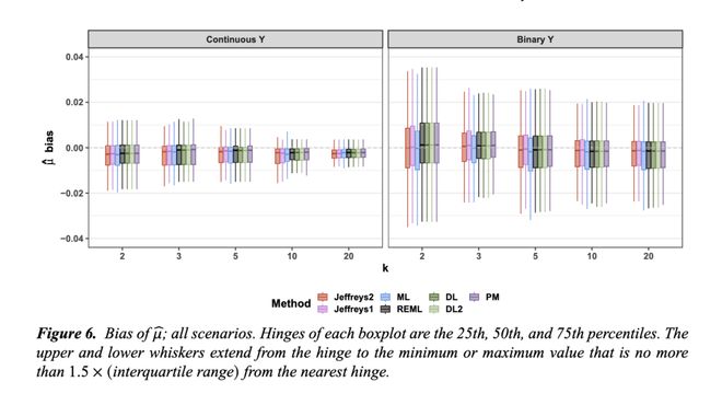 亮点• 已有认知:在小型元分析中,表现最佳的随机效应元分析频率学派方法可能高度不精确,并对异质性提供有偏估计。• 本文新贡献:我们开展了一项大规模模拟研究,评估了两种形式的杰弗里斯先验在元分析中的表现,这两种先验对应于最大似然估计量的Firth偏差校正。• 对RSM读者的潜在影响:对于二分类结局的小型元分析,Jeffreys2先验在均值参数的点估计和区间估计方面可能优于标准频率学派方法。
