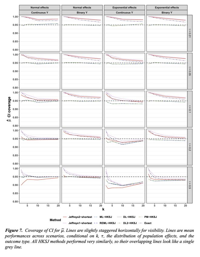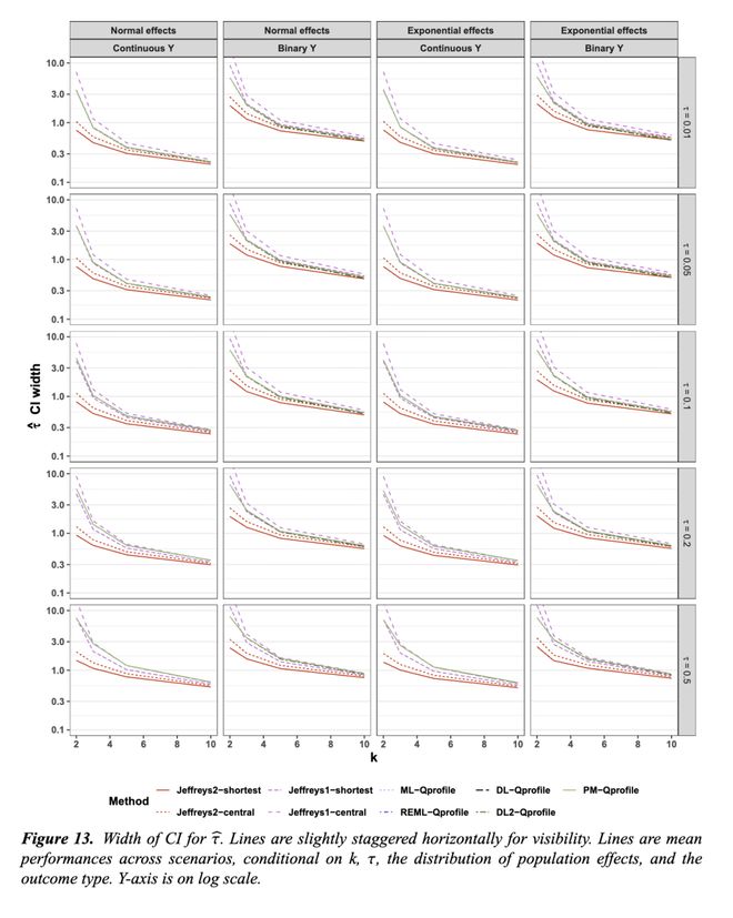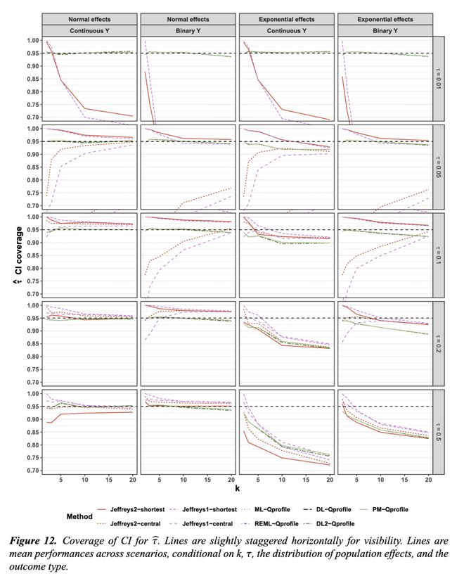 Langan 等人(2019)⁷ 的模拟研究未评估基于轮廓似然、自助法(bootstrapping)或精确方法(exact method)的区间;其中后者是近期才被提出。关于轮廓似然区间,文献中的建议并不一致。一篇有影响力的文章指出:“轮廓似然是计算置信区间的一种良好方法。”⁴⁸ 一项模拟研究似乎支持这一建议,发现当异质性大于零时,轮廓似然区间最接近名义覆盖水平。¹⁰ 然而,另一项模拟研究则表明,在仅包含5项研究的元分析中,轮廓似然区间常常出现覆盖不足的问题。³⁹ 精确方法的提出者提供了模拟结果,表明尽管该方法在理论上保证至少达到名义覆盖水平,但其所得区间并不比现有方法显著更宽。¹⁸ 尽管我们的模拟研究主要动机在于考察杰弗里斯方法,但其次要贡献在于更全面地评估轮廓似然、自助法和精确区间。